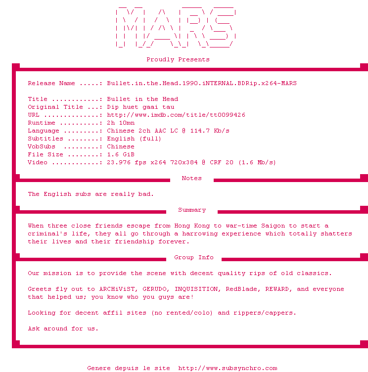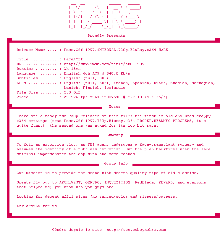 Voir le nfo de la release Face.Off.1997.iNTERNAL.720p.BluRay.x264-MARS