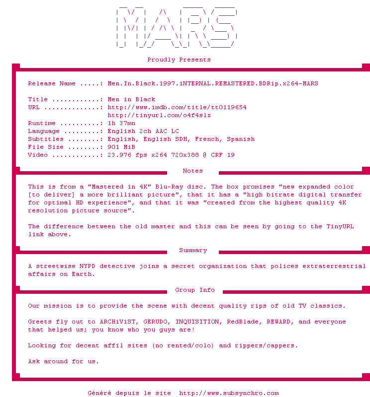 Voir le nfo de la release Men.In.Black.1997.iNTERNAL.REMASTERED.BDRip.x264-MARS