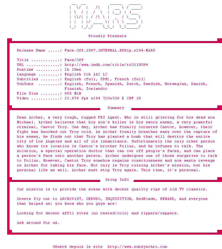 Voir le nfo de la release Face.Off.1997.iNTERNAL.BDRip.x264-MARS