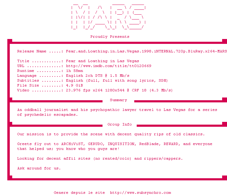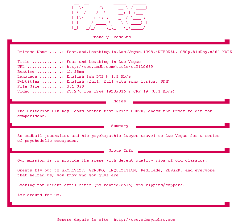 Voir le nfo de la release Fear.And.Loathing.In.Las.Vegas.1998.iNTERNAL.1080p.BluRay.x264-MARS