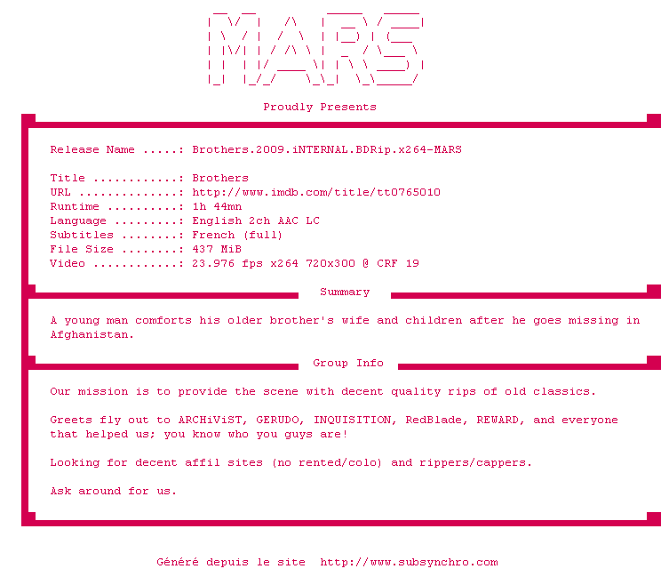 Voir le nfo de la release Brothers.2009.iNTERNAL.BDRip.x264-MARS