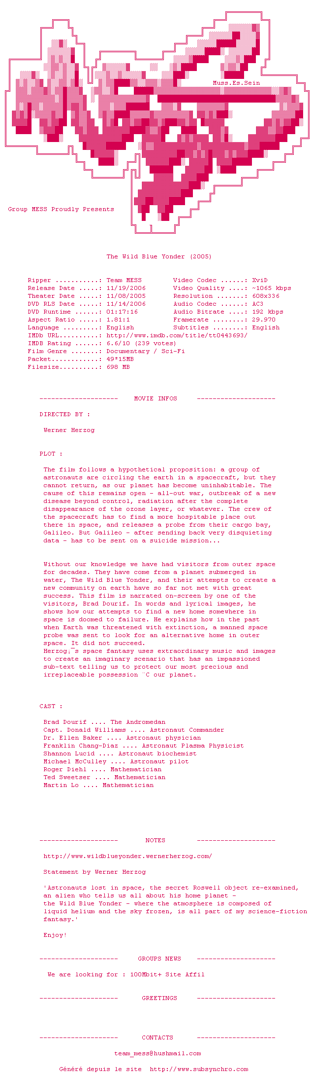 Voir le nfo de la release The.Wild.Blue.Yonder.2005.LiMiTED.DVDRip.XviD-MESS