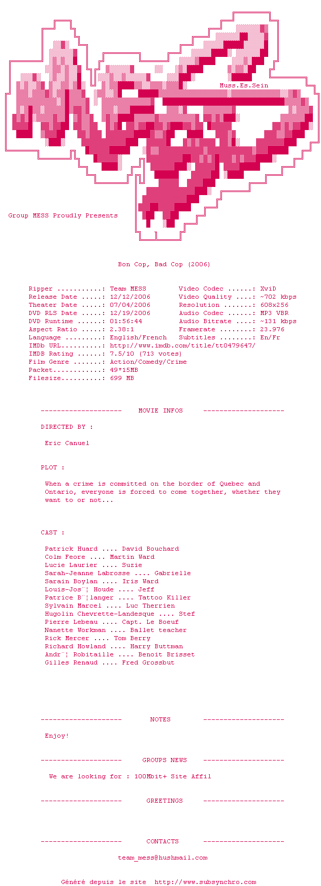 Voir le nfo de la release Bon.Cop.Bad.Cop.2006.LIMITED.DVDRip.XviD-MESS