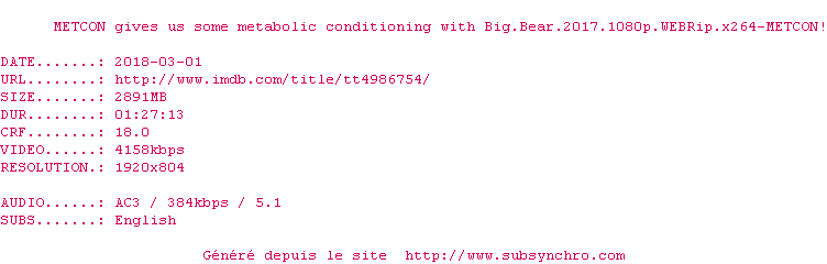 Voir le nfo de la release Big.Bear.2017.1080p.WEBRip.x264-METCON