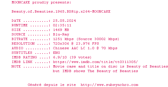 Voir le nfo de la release Beauty.Of.Beauties.1965.720p.BluRay.x264-MOONCAKE