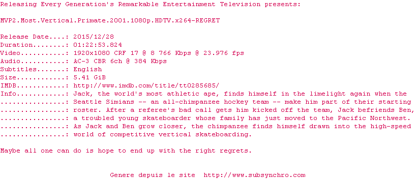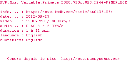 Voir le nfo de la release MVP.Most.Valuable.Primate.2000.iNTERNAL.DVDRip.XViD-MULTiPLY