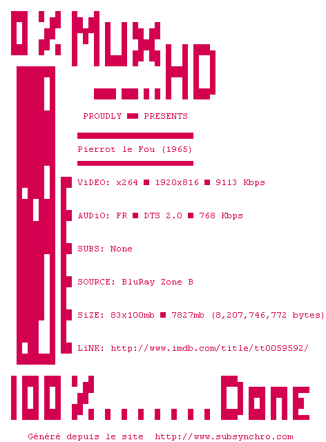 Voir le nfo de la release Pierrot.Le.Fou.1965.FRENCH.1080p.BluRay.x264.DTS-MUxHD