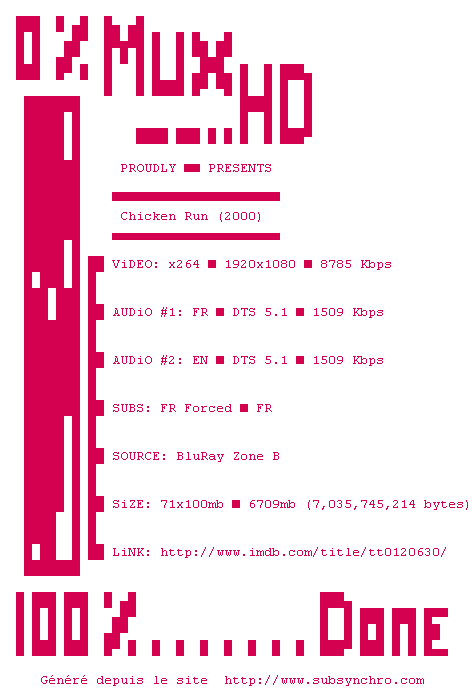 Voir le nfo de la release Chicken.Run.2000.MULTi.1080p.BluRay.x264-MUxHD