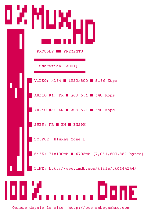 Voir le nfo de la release Swordfish.2001.MULTi.1080p.BluRay.x264-MUxHD