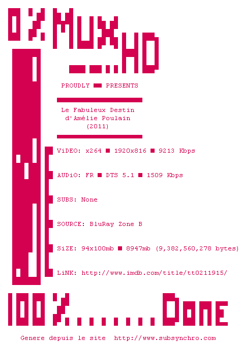 Voir le nfo de la release Le.Fabuleux.Destin.D.Amelie.Poulain.2001.FRENCH.1080p.BluRay.x264.DTS-MUxHD