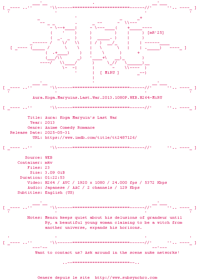 Voir le nfo de la release Aura.Koga.Maryuins.Last.War.2013.1080P.WEB.H264-MiRU