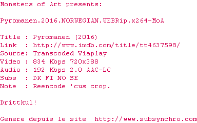 Voir le nfo de la release Pyromanen.2016.NORWEGIAN.WEBRip.x264-MoA
