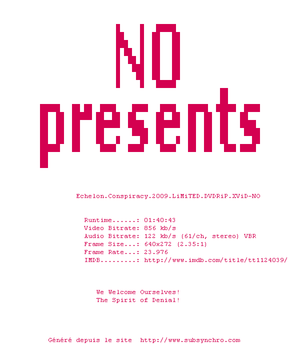 Voir le nfo de la release Echelon.Conspiracy.2009.LiMiTED.DVDRiP.XViD-NO