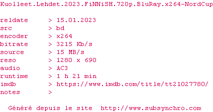 Voir le nfo de la release Kuolleet.Lehdet.2023.FiNNiSH.720p.BluRay.x264-NordCup