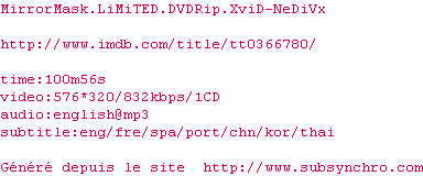 Voir le nfo de la release MirrorMask.LiMiTED.DVDRip.XviD-NeDiVx