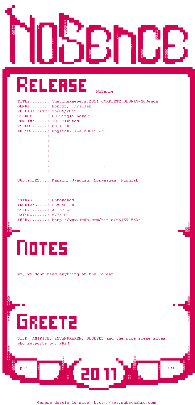 Voir le nfo de la release The.Innkeepers.2011.COMPLETE.BLURAY-NoSence