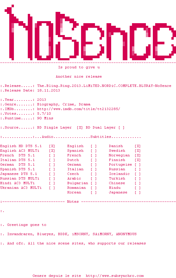 Voir le nfo de la release The.Bling.Ring.2013.LiMiTED.NORDiC.COMPLETE.BLURAY-NoSence