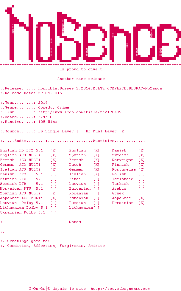 Voir le nfo de la release Horrible.Bosses.2.2014.MULTi.COMPLETE.BLURAY-NoSence