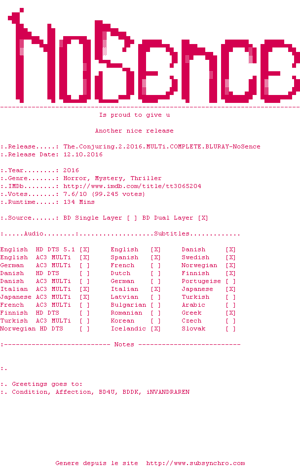 Voir le nfo de la release The.Conjuring.2.2016.MULTi.COMPLETE.BLURAY-NoSence