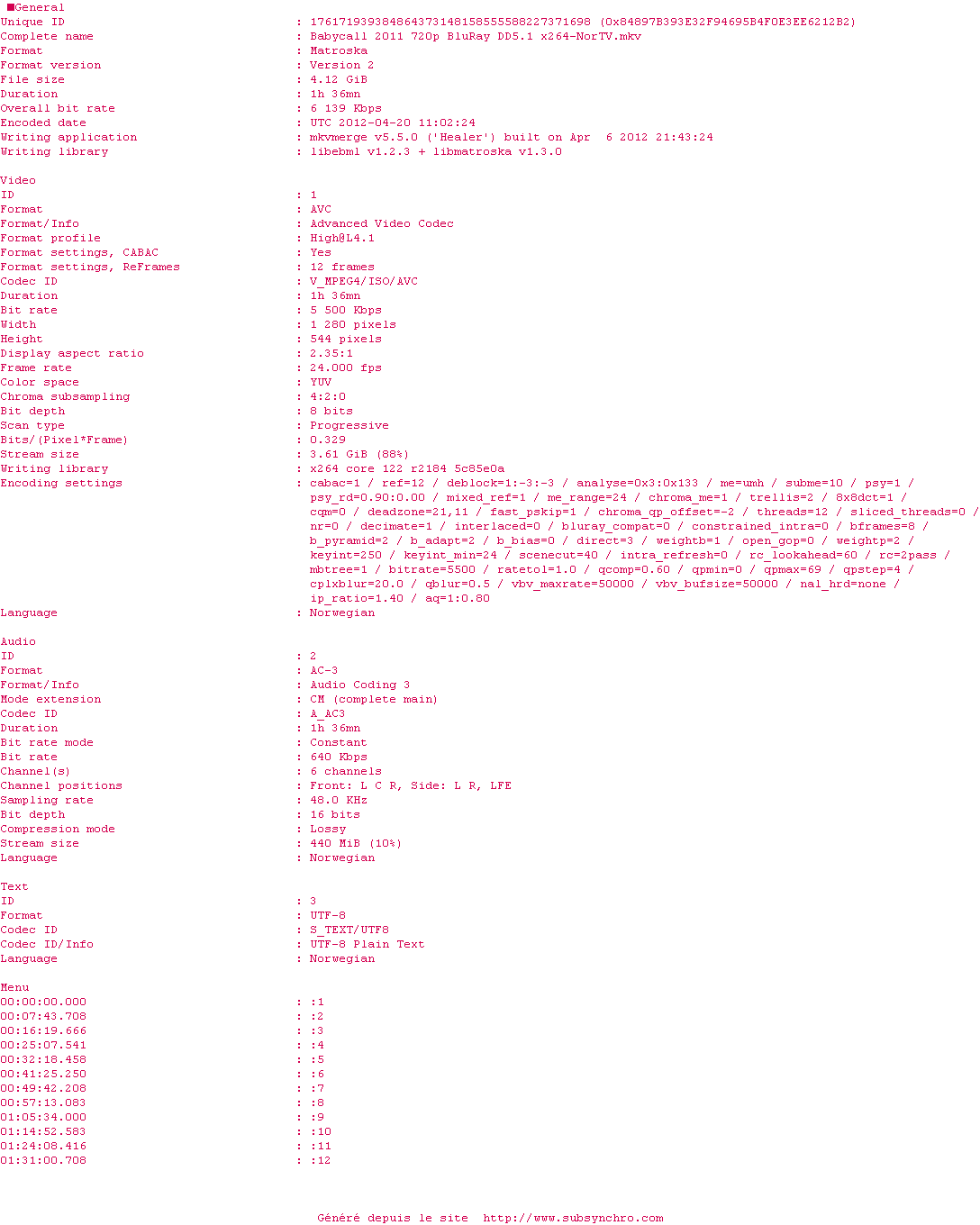 Voir le nfo de la release Babycall.2011.720p.BluRay.DD5.1.x264-NorTV
