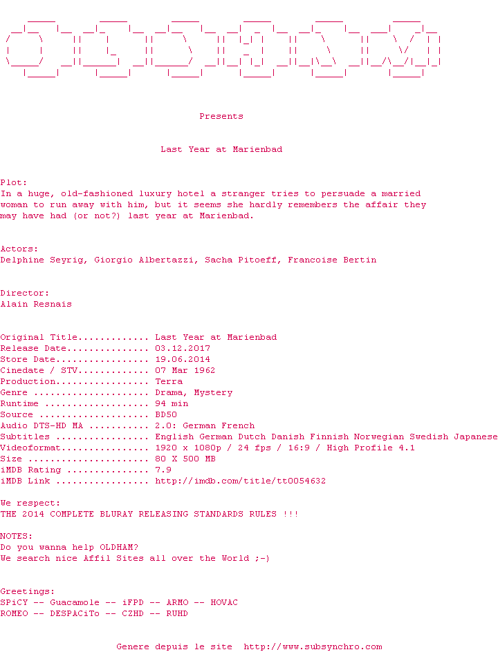 Voir le nfo de la release Last.Year.At.Marienbad.1961.COMPLETE.BLURAY-OLDHAM