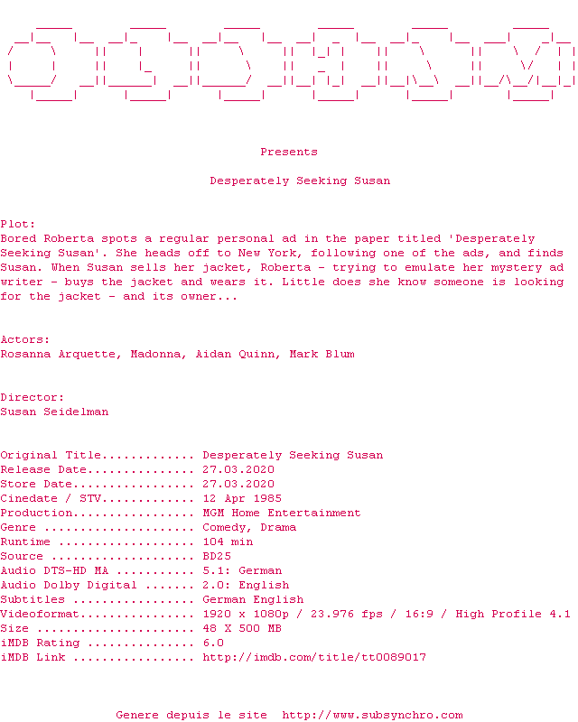 Voir le nfo de la release Desperately.Seeking.Susan.1985.MULTi.COMPLETE.BLURAY-OLDHAM