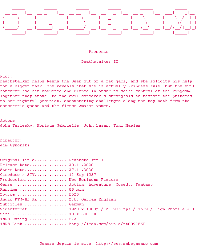 Voir le nfo de la release Deathstalker.II.DC.1987.MULTi.COMPLETE.BLURAY-OLDHAM