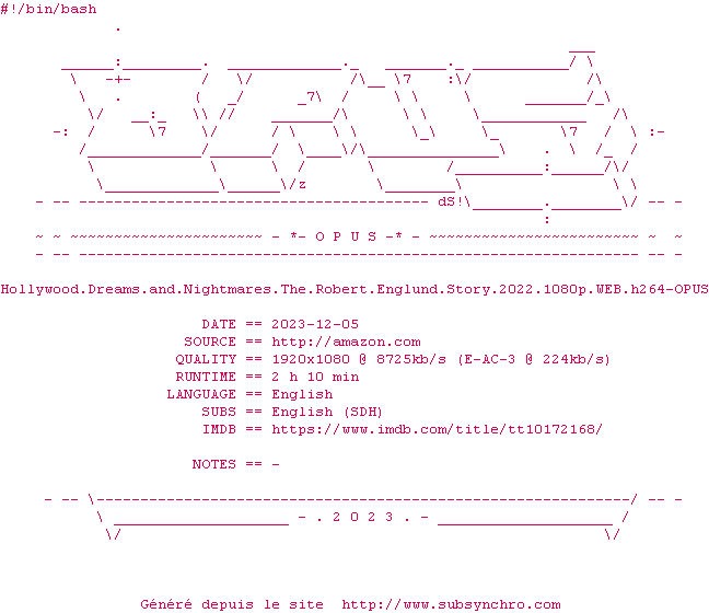Voir le nfo de la release Hollywood.Dreams.And.Nightmares.The.Robert.Englund.Story.2022.1080p.WEB.H264-OPUS