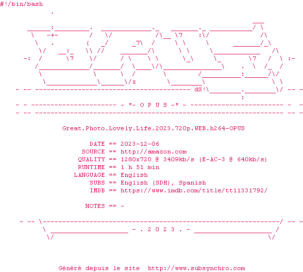 Voir le nfo de la release Great.Photo.Lovely.Life.2023.720p.WEB.H264-OPUS