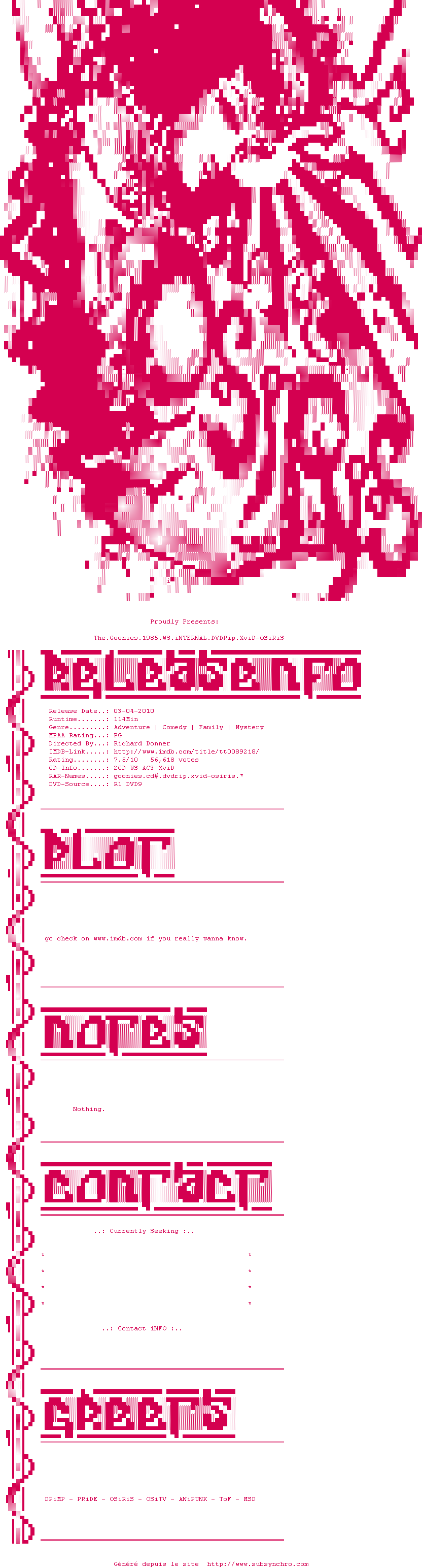 Voir le nfo de la release The.Goonies.1985.WS.iNTERNAL.DVDRip.XviD-OSiRiS