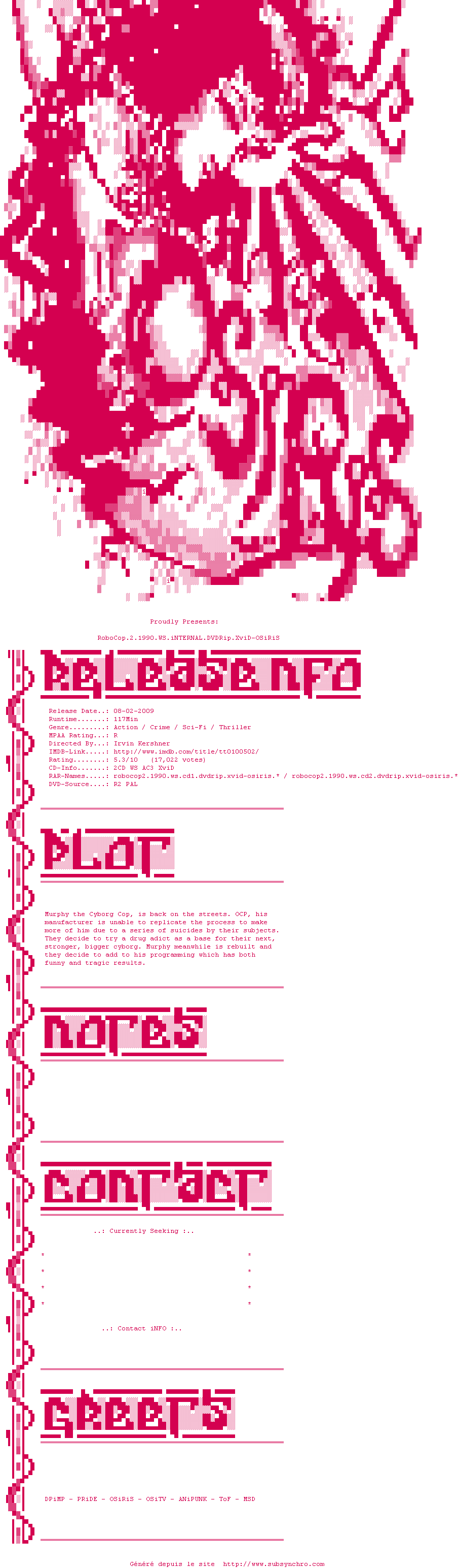 Voir le nfo de la release RoboCop.2.1990.WS.iNTERNAL.DVDRip.XviD-OSiRiS