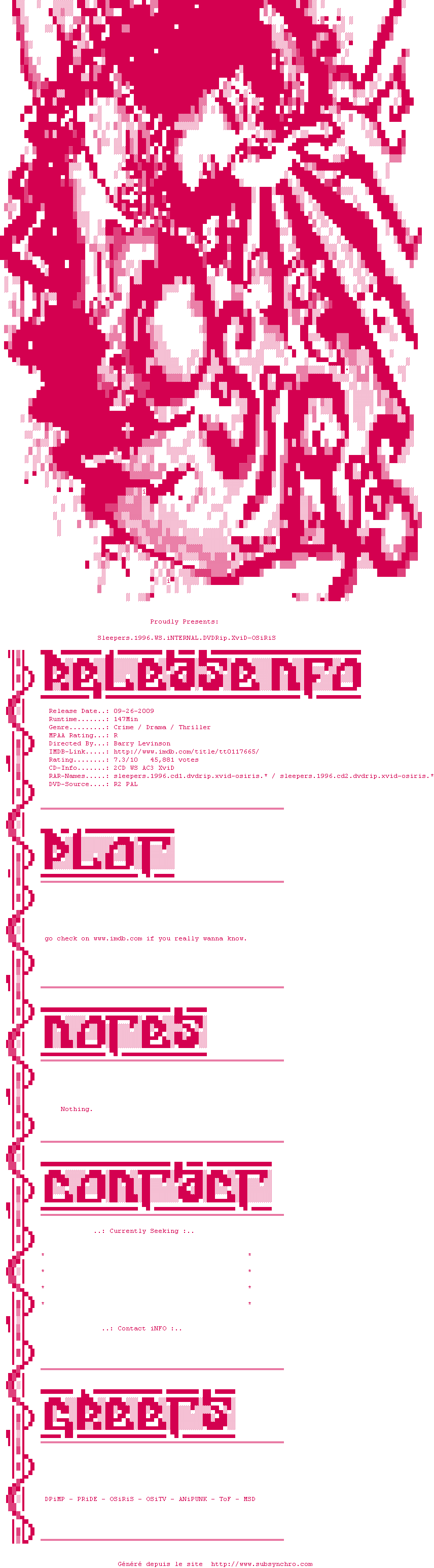 Voir le nfo de la release Sleepers.1996.WS.iNTERNAL.DVDRip.XviD-OSiRiS