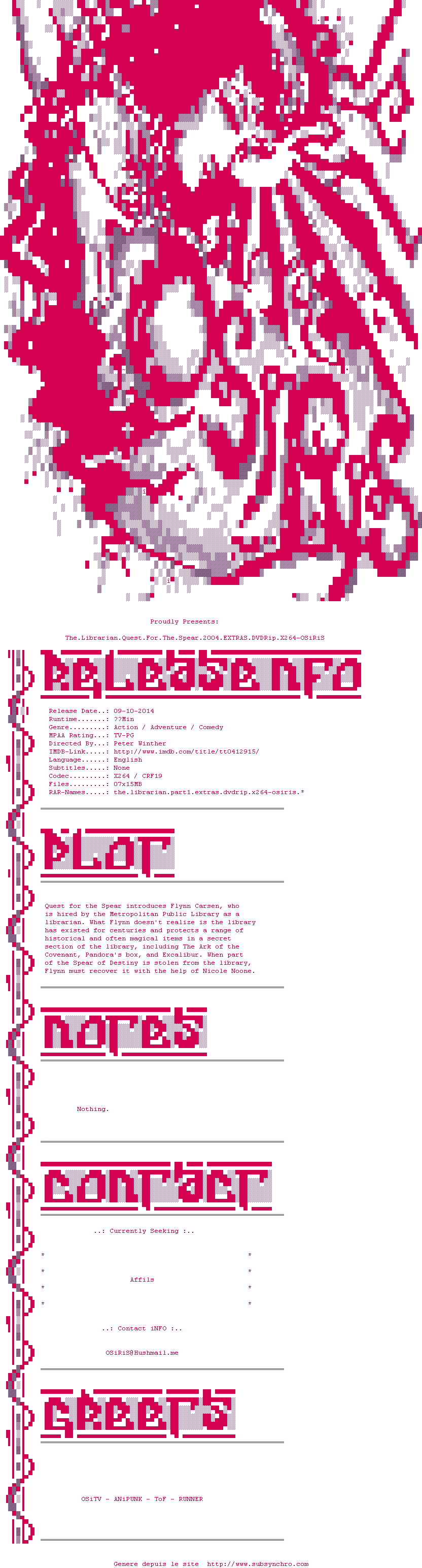 Voir le nfo de la release The.Librarian.Quest.For.The.Spear.2004.EXTRAS.DVDRip.x264-OSiRiS