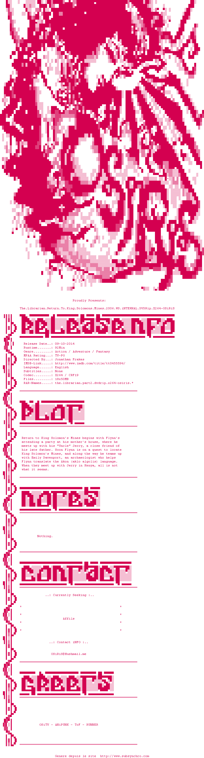 Voir le nfo de la release The.Librarian.Return.To.King.Solomons.Mines.2006.WS.iNTERNAL.DVDRip.x264-OSiRiS