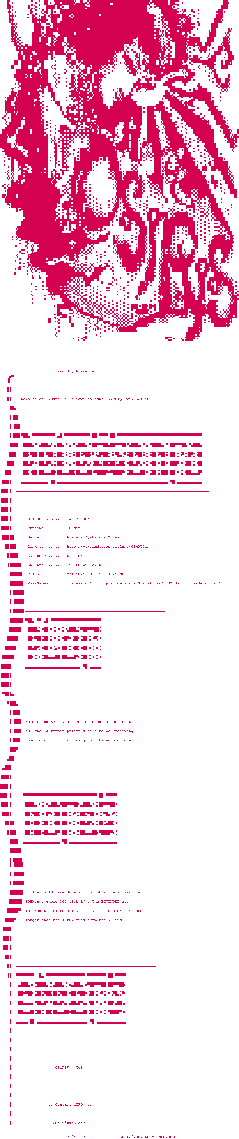 Voir le nfo de la release The.X.Files.I.Want.To.Believe.EXTENDED.DVDRip.XviD-OSiRiS