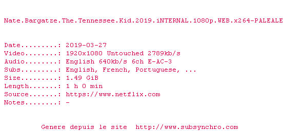 Voir le nfo de la release Nate.Bargatze.The.Tennessee.Kid.2019.iNTERNAL.1080p.WEB.x264-PALEALE
