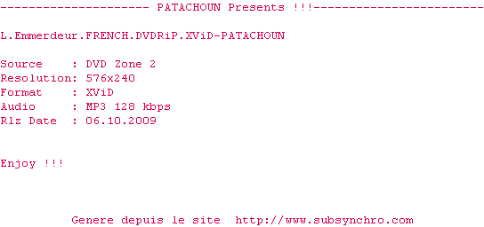 Voir le nfo de la release L.Emmerdeur.FRENCH.DVDRiP.XViD-PATACHOUN