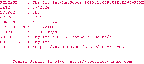 Voir le nfo de la release The.Boy.In.The.Woods.2023.2160P.WEB.H265-POKE