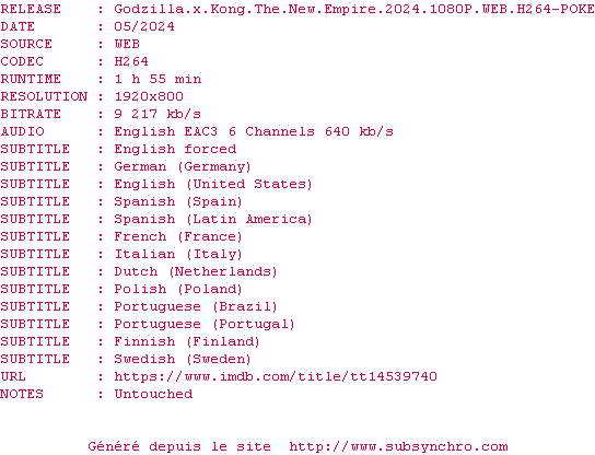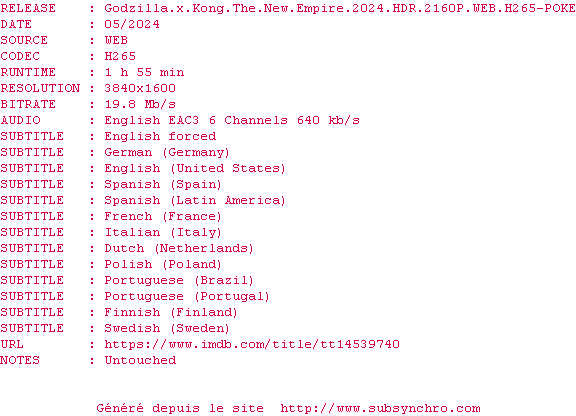 Voir le nfo de la release Godzilla.X.Kong.The.New.Empire.2024.2160P.WEB.H265-POKE