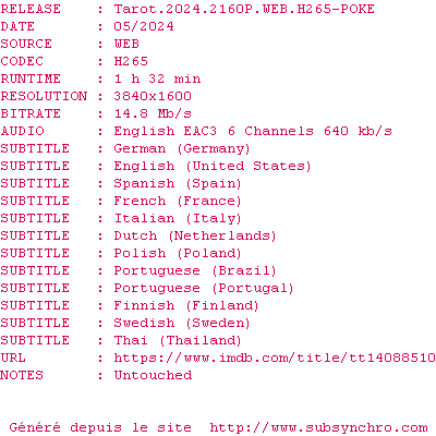 Voir le nfo de la release Tarot.2024.2160P.WEB.H265-POKE