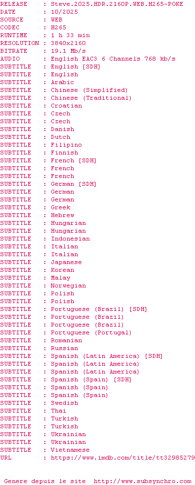 Voir le nfo de la release Steve.2025.HDR.2160P.WEB.H265-POKE