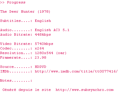 Voir le nfo de la release The.Deer.Hunter.1978.720p.HDDVDRip.x264-PROGRESS