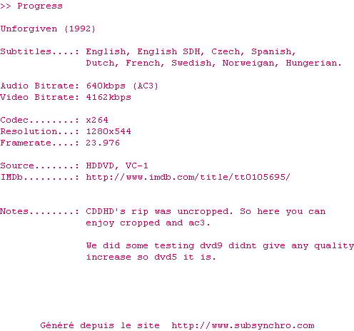 Voir le nfo de la release Unforgiven.1992.DVD5.720p.HDDVD.x264.PROPER-PROGRESS