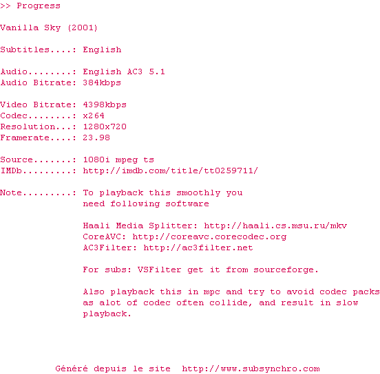 Voir le nfo de la release Vanilla.Sky.720p.AC3.5.1.x264-PROGRESS