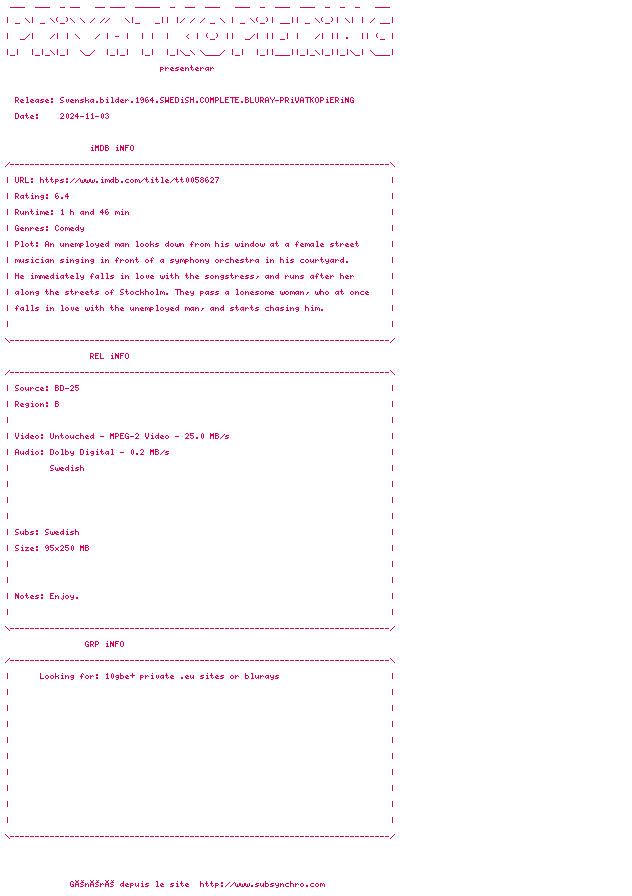 Voir le nfo de la release Svenska.Bilder.1964.SWEDiSH.COMPLETE.BLURAY-PRiVATKOPiERiNG