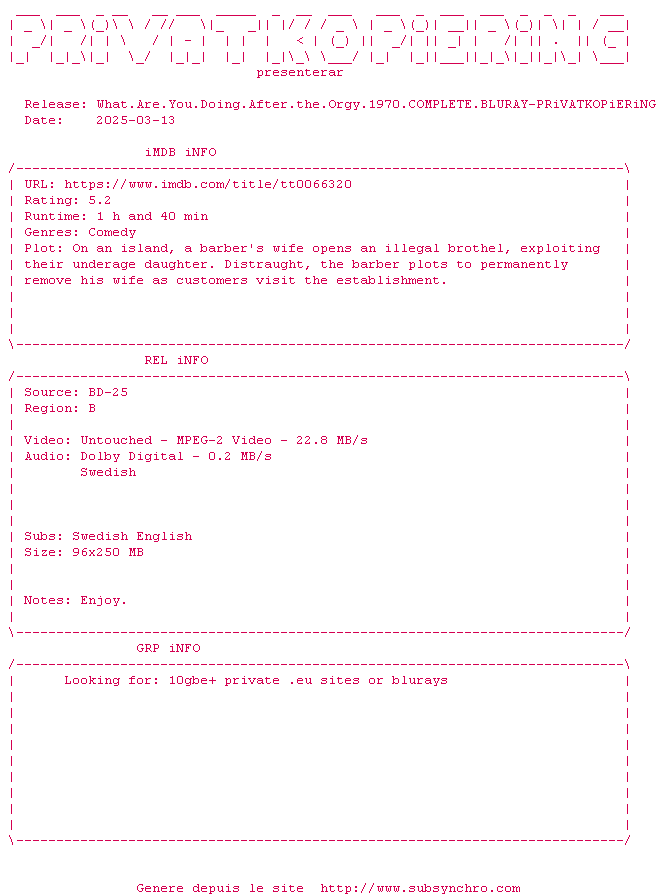 Voir le nfo de la release What.Are.You.Doing.After.The.Orgy.1970.COMPLETE.BLURAY-PRiVATKOPiERiNG
