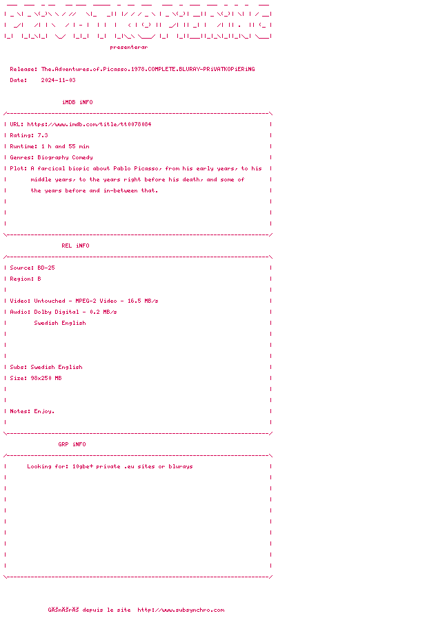 Voir le nfo de la release The.Adventures.Of.Picasso.1978.COMPLETE.BLURAY-PRiVATKOPiERiNG