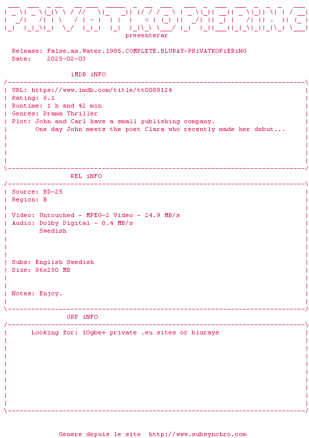 Voir le nfo de la release False.As.Water.1985.COMPLETE.BLURAY-PRiVATKOPiERiNG