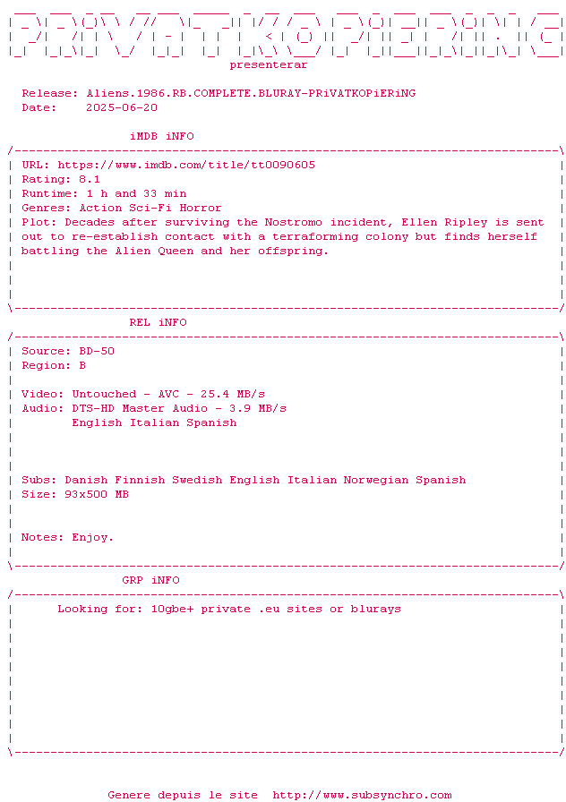Voir le nfo de la release Aliens.1986.RB.COMPLETE.BLURAY-PRiVATKOPiERiNG