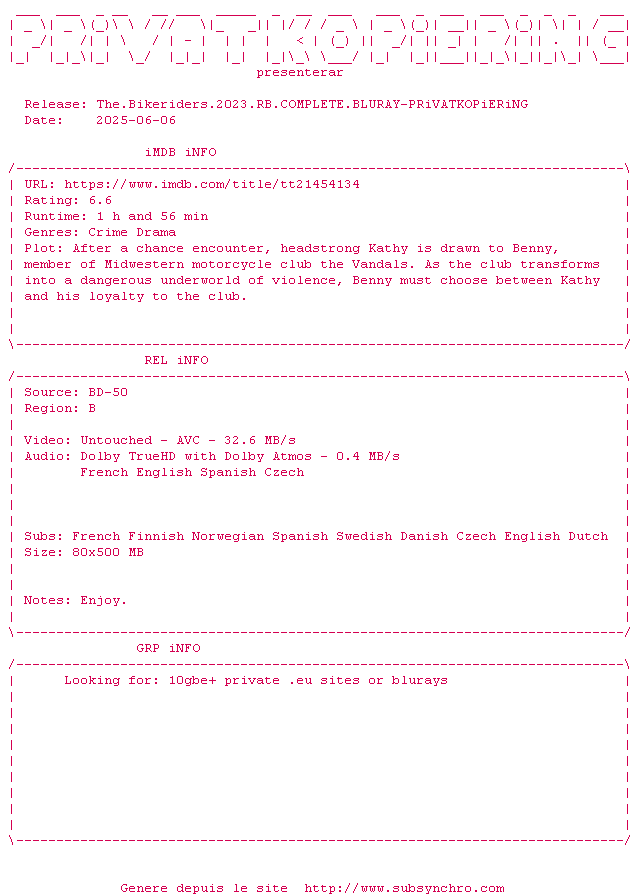 Voir le nfo de la release The.Bikeriders.2023.RB.COMPLETE.BLURAY-PRiVATKOPiERiNG